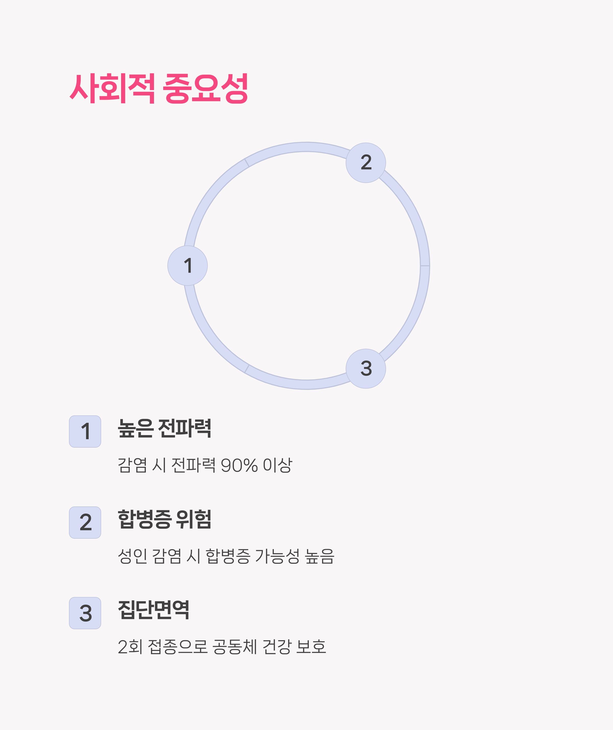 - 성인 감염 시 폐렴, 중이염 등 합병증 가능성 높음
