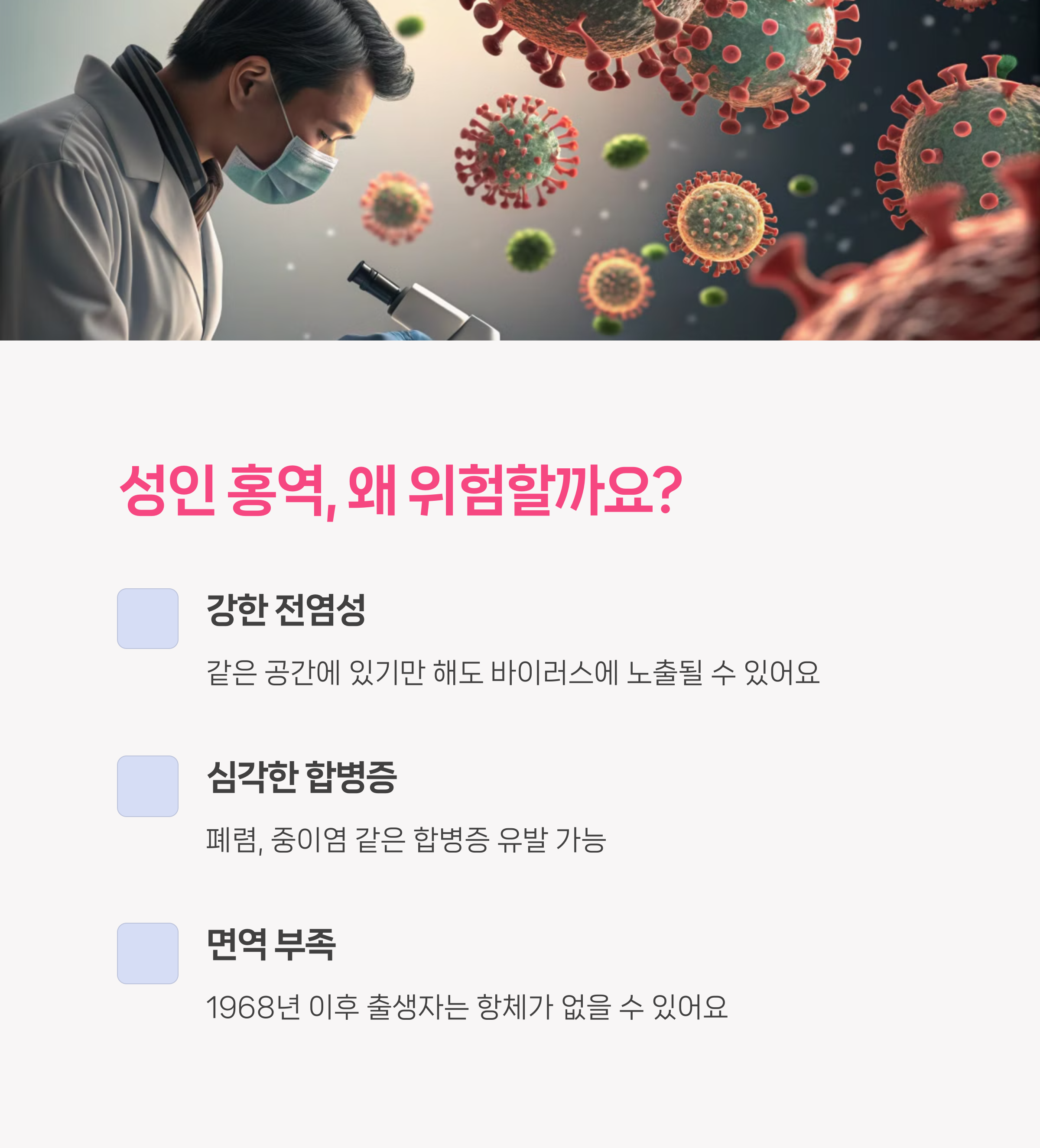 이건 단순히 나 자신만을 위한 문제가 아니에요. 홍역은 공기로 전파되기 때문에 한 명이 걸리면 순식간에 퍼질 수 있거든요.