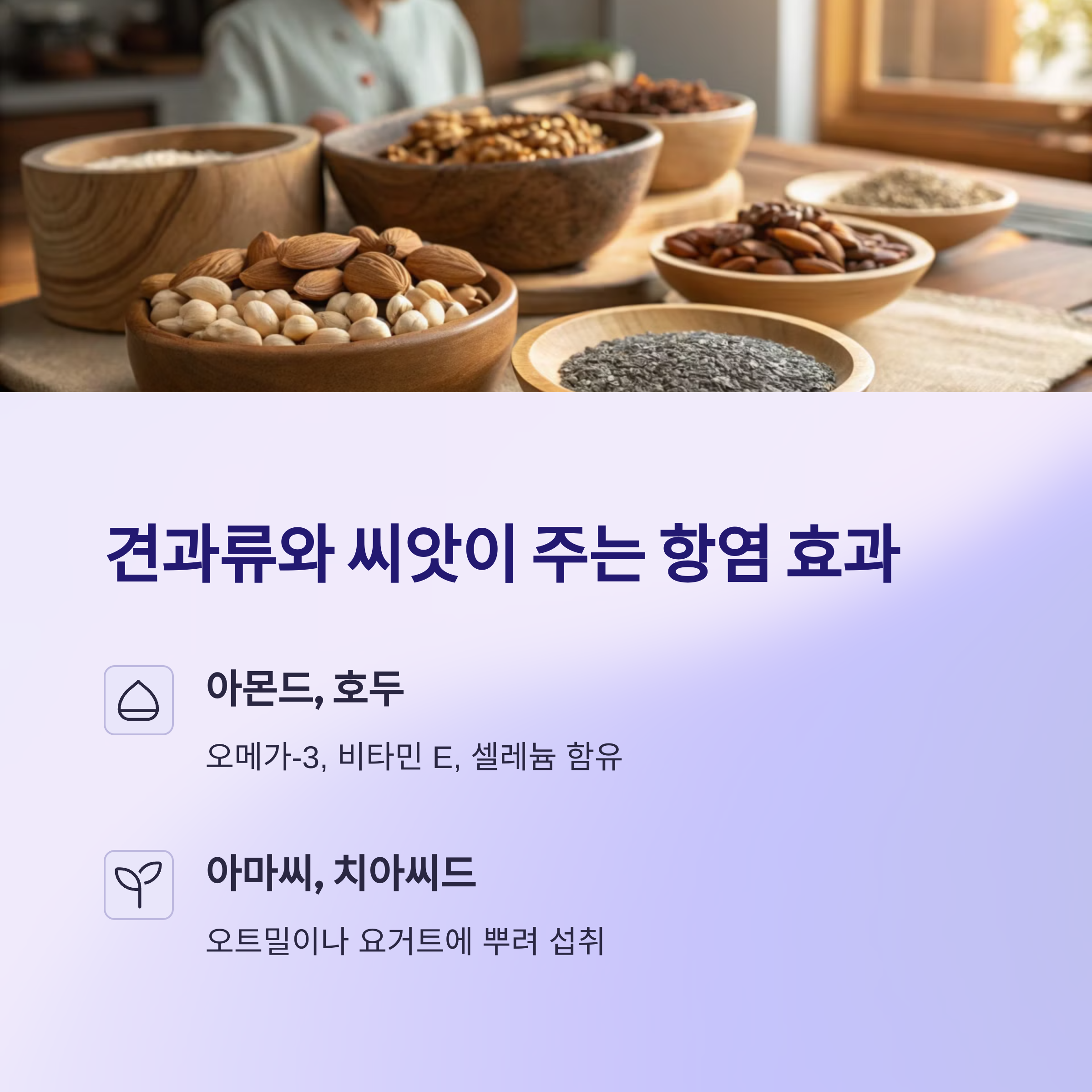 아몬드, 호두, 아마씨, 치아씨드 같은 견과류와 씨앗류는 오메가-3, 비타민 E, 셀레늄 등 항산화 성분이 가득해요.