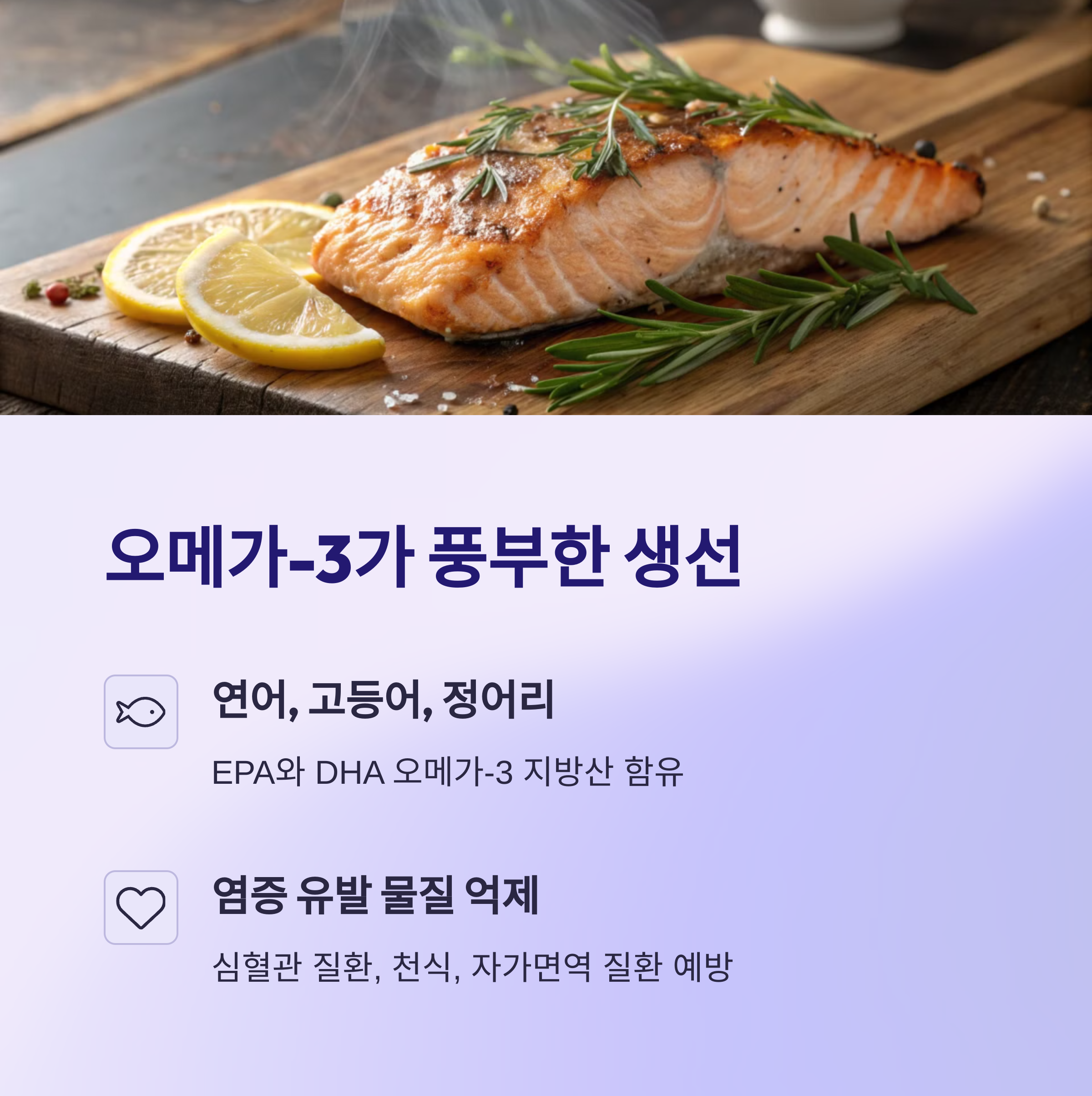 특히 일주일에 2~3회 생선을 꾸준히 섭취하면 만성 염증을 줄이는 데 효과가 크죠.