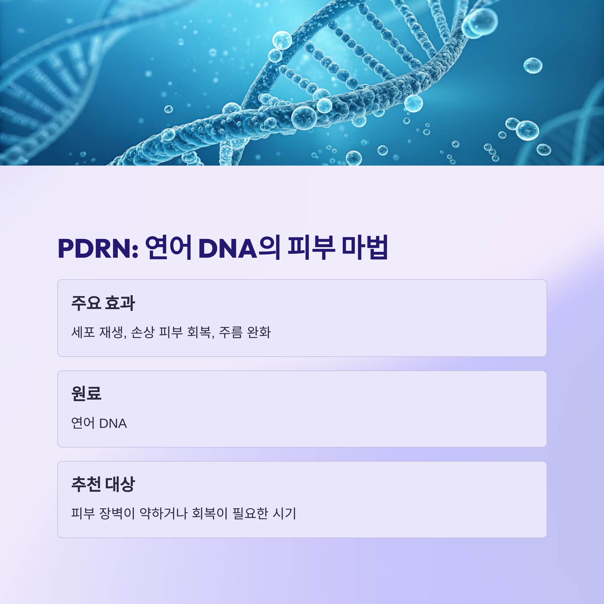 PDRN은 '폴리데옥시리보뉴클레오티드'의 약자로, 주로 연어의 생식세포에서 추출한 DNA 성분이에요.