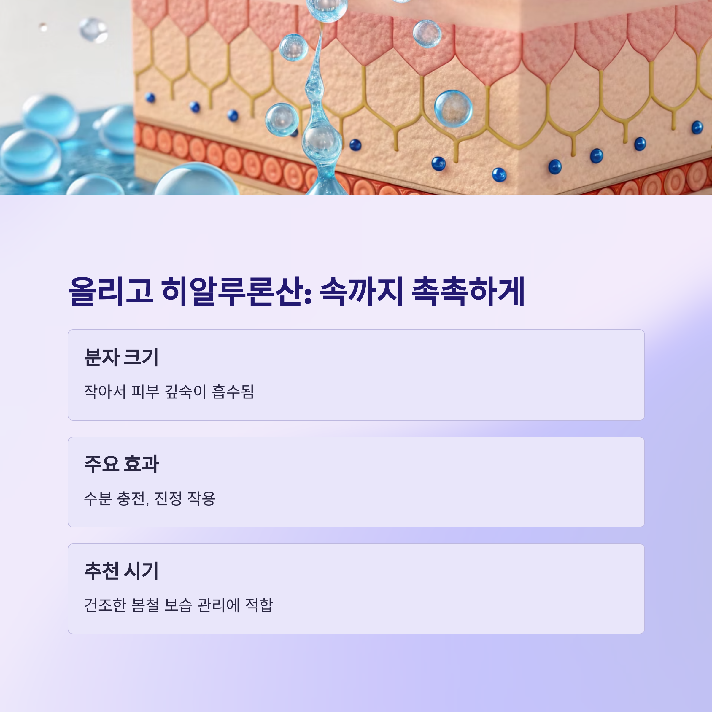 특히 분자 크기가 작아 피부 속까지 흡수되는 올리고 히알루론산은 진정과 수분 공급을 동시에 해줘서 요즘 같은 건조한 봄철에 딱이죠.