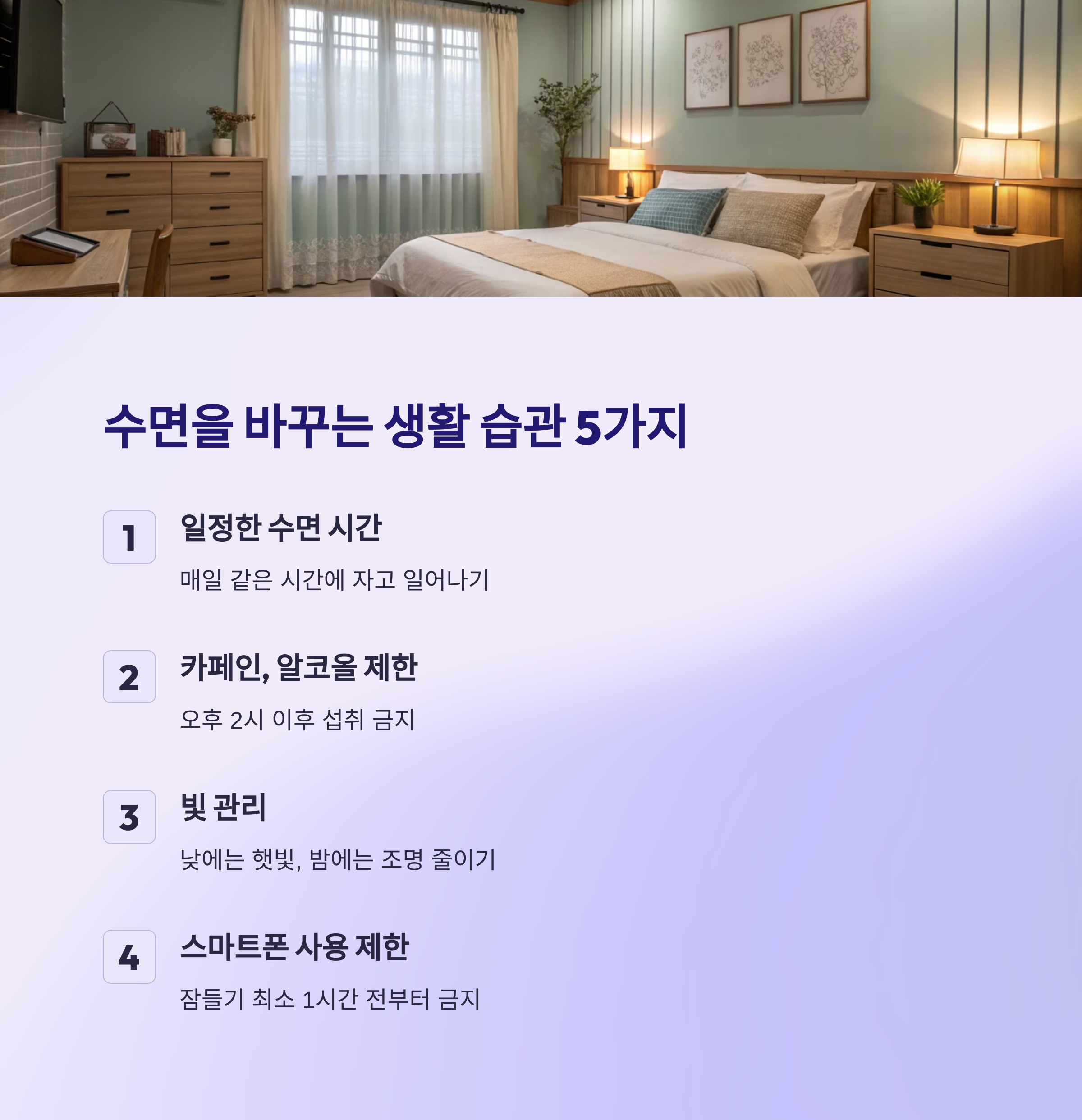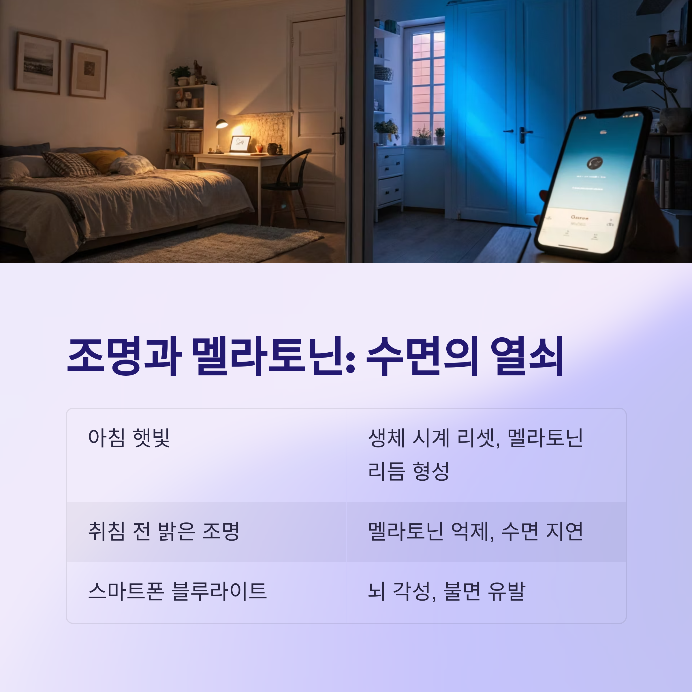 | 취침 직전 밝은 조명 | 멜라토닌 억제로 수면 유도 지연 |