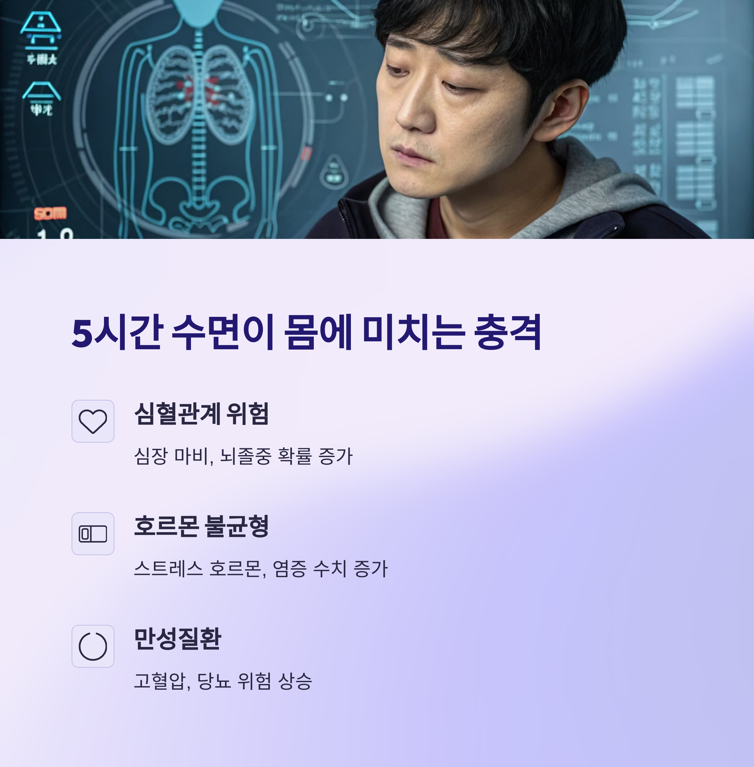 서울대병원 주은현 교수에 따르면 5시간 미만의 수면은 단순히 피곤함을 넘어서 신체 전반에 치명적인 영향을 줍니다.