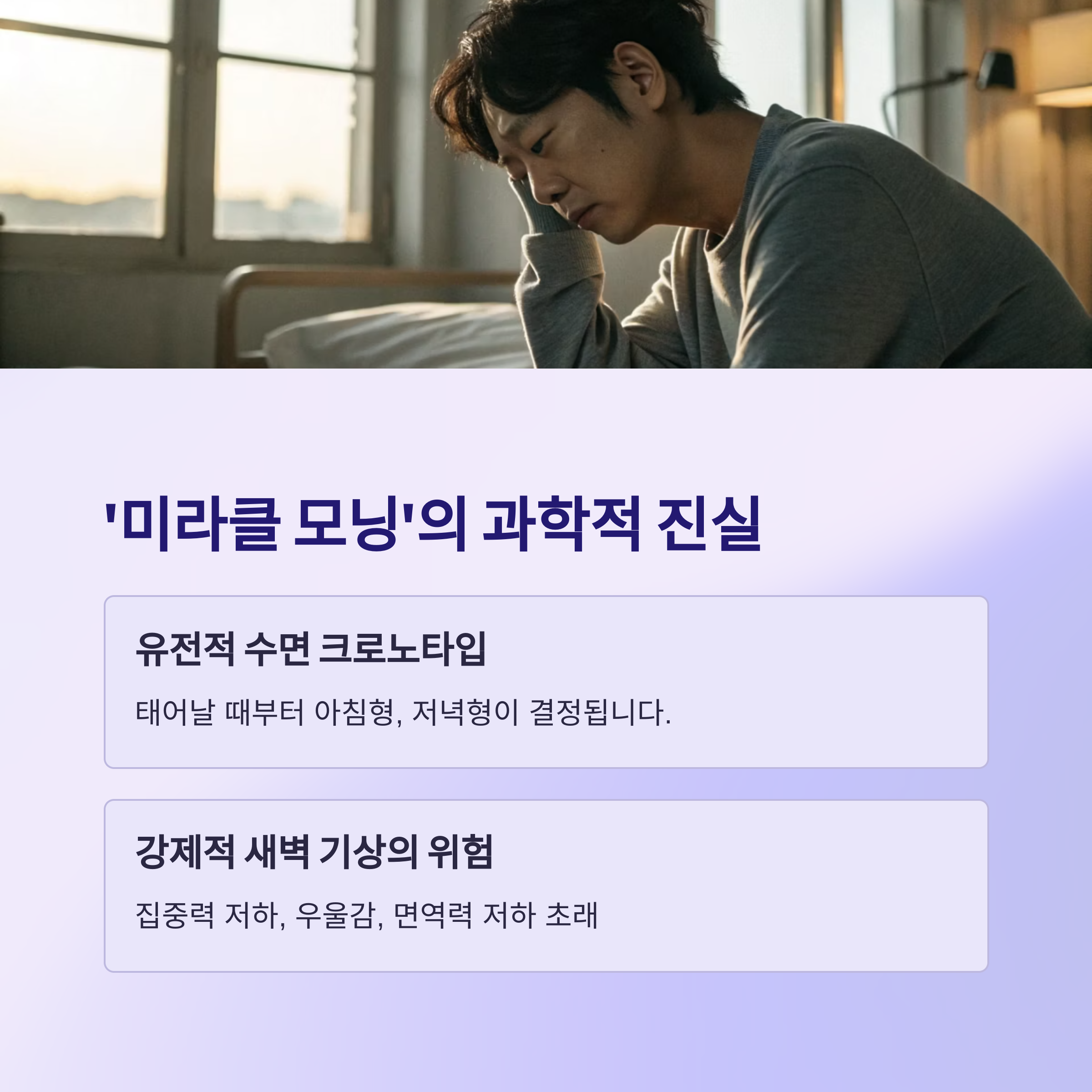 즉, 아침형 인간이 아닌 사람이 억지로 새벽에 일어나는 것은 오히려 집중력 저하, 우울감, 면역력 저하를 초래할 수 있습니다.
