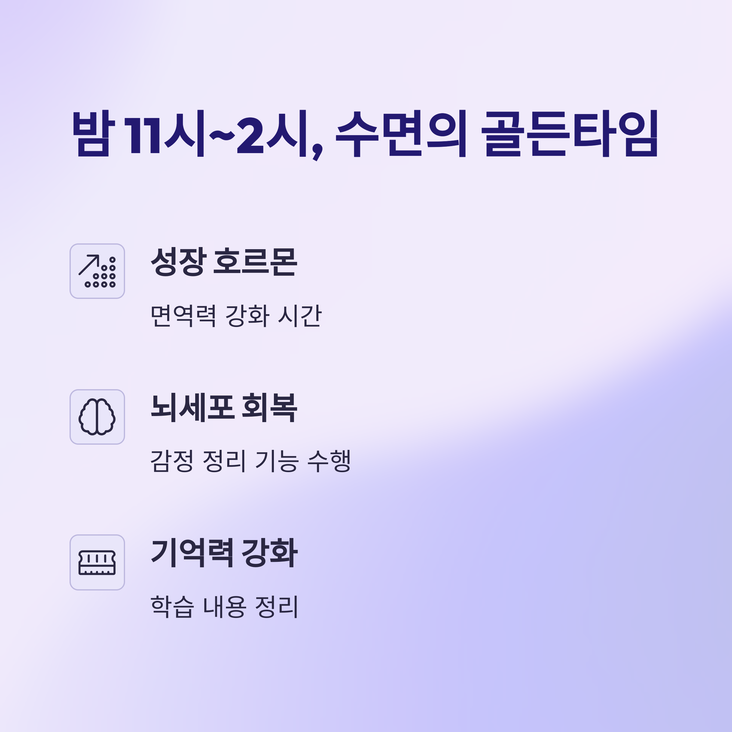 문제는 수면의 '시간대'입니다. 밤 11시~2시의 깊은 잠이 뇌 회복에 핵심인데, 이 타이밍을 놓치면 수면의 질이 크게 저하될 수 있습니다.