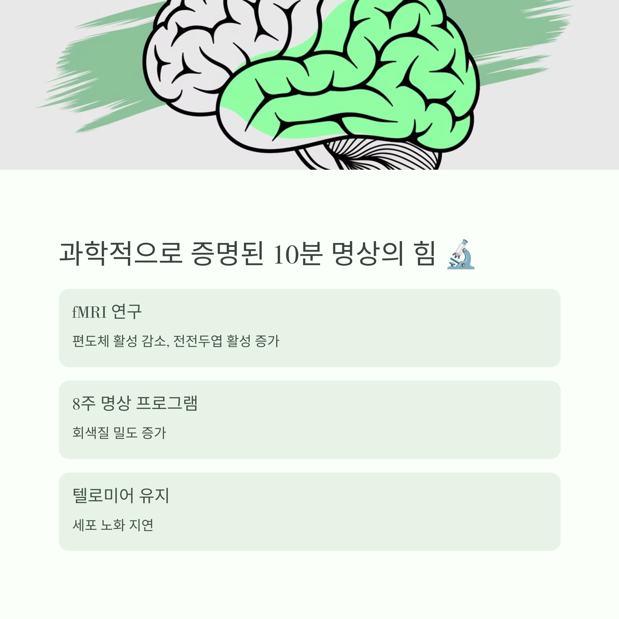 명상은 단순한 휴식이 아닙니다. 꾸준한 명상은 우리의 뇌 구조를 변화시키고, 감정을 더 효과적으로 조절하도록 돕습니다. 연구에 따르면, 매일 10분씩 명상하는 것만으로도 불안감과 우울감이 감소하며, 집중력과 창의력이 향상된다고 합니다. 또한, 명상은 자율신경계를 조절하여 스트레스 반응을 줄이고, 더 평온한 일상을 만들어 줍니다.