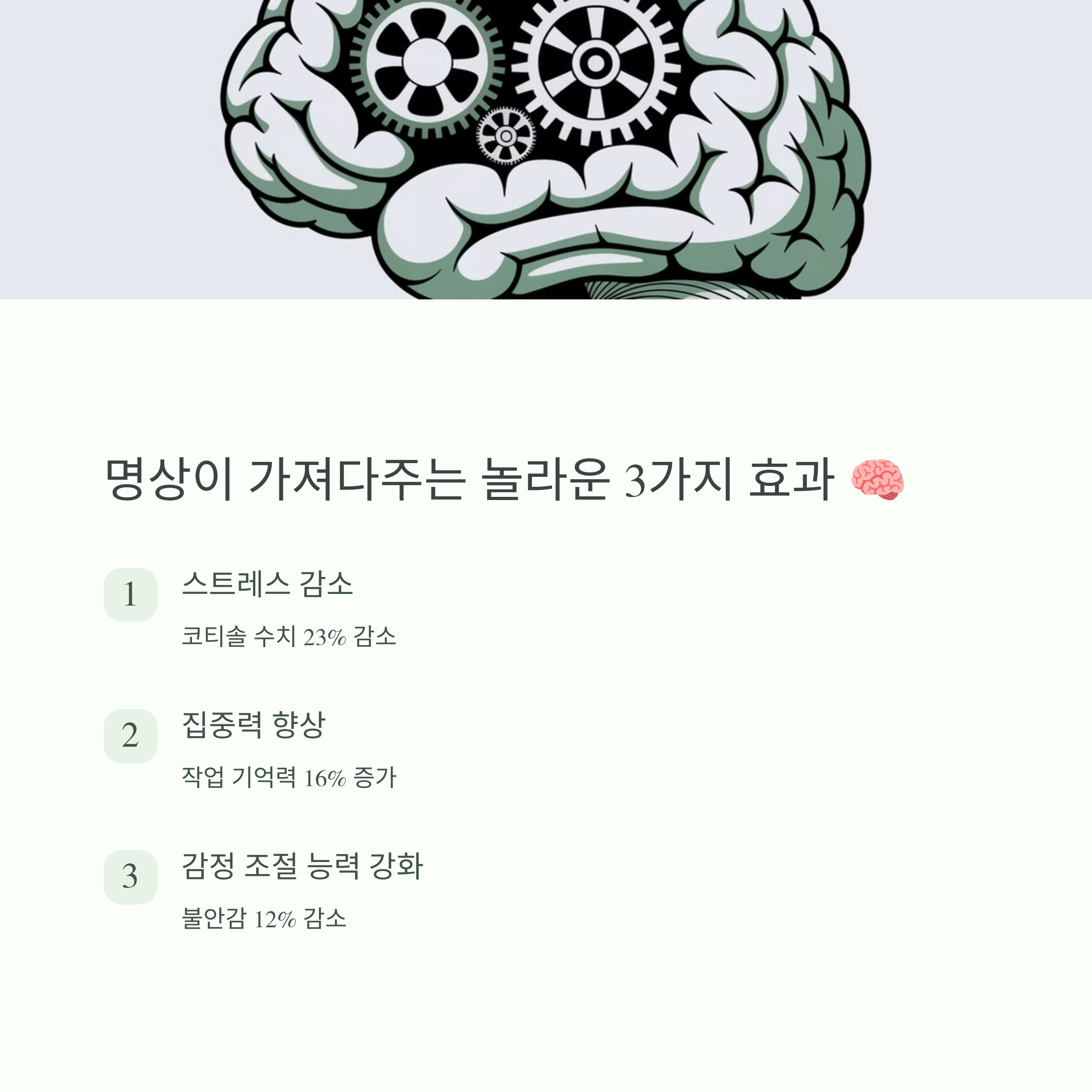 | 명상의 효과 | 스트레스 감소, 집중력 향상, 감정 조절 능력 강화 |