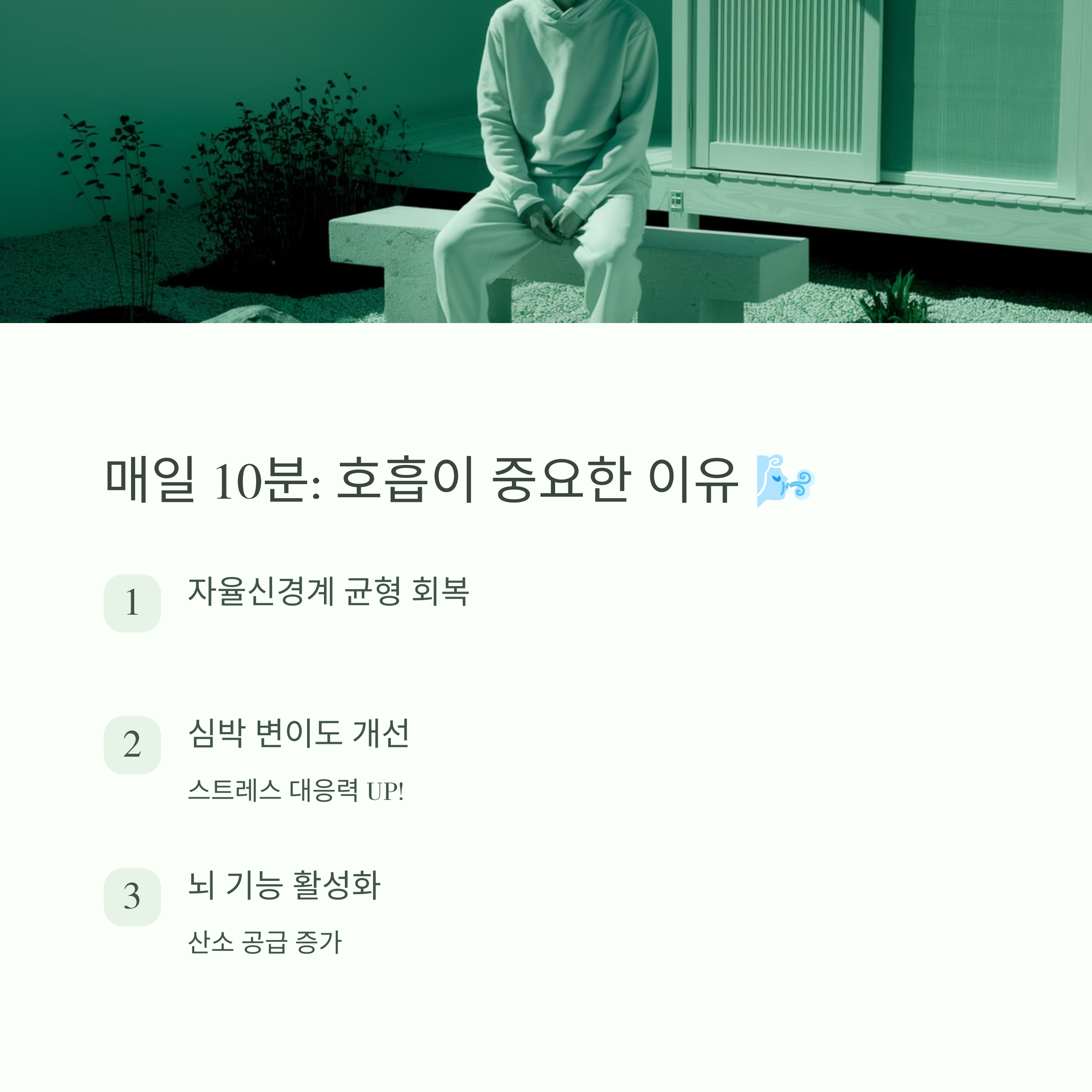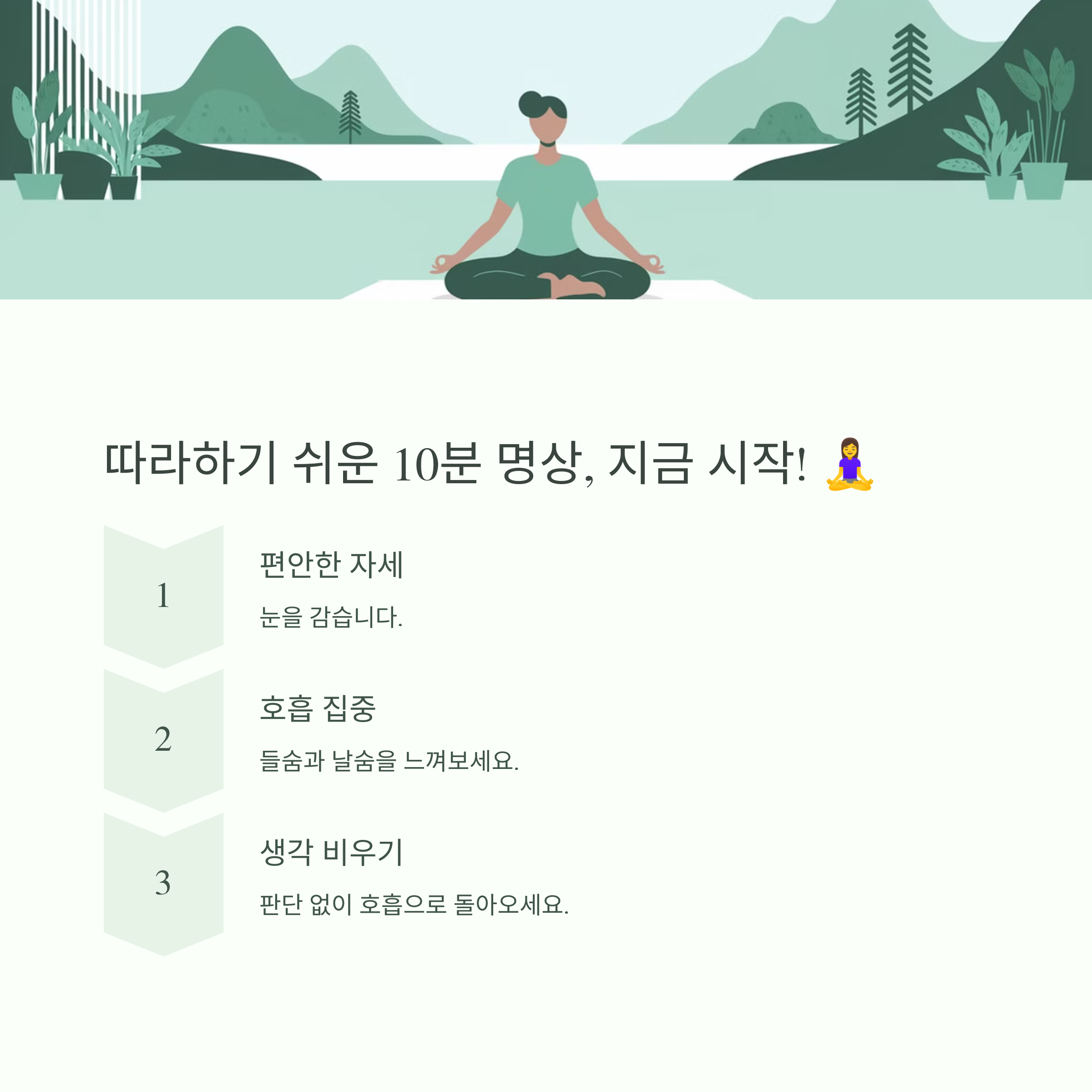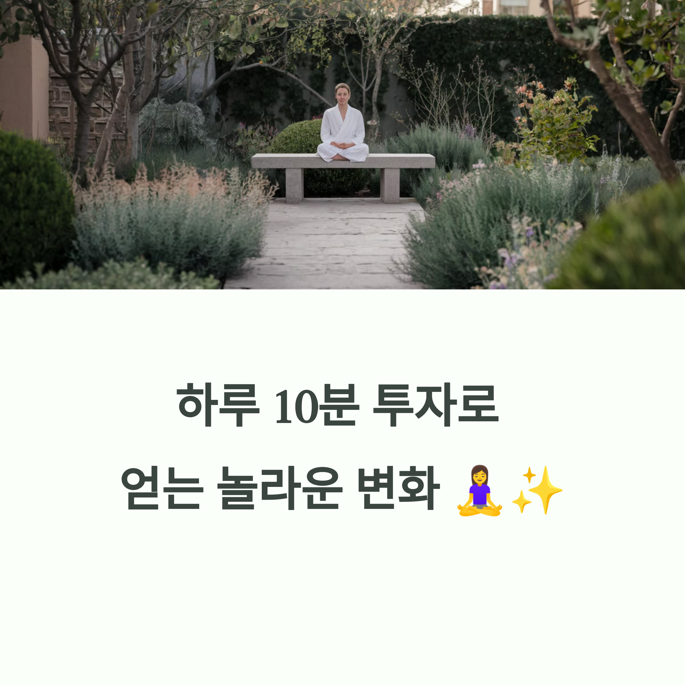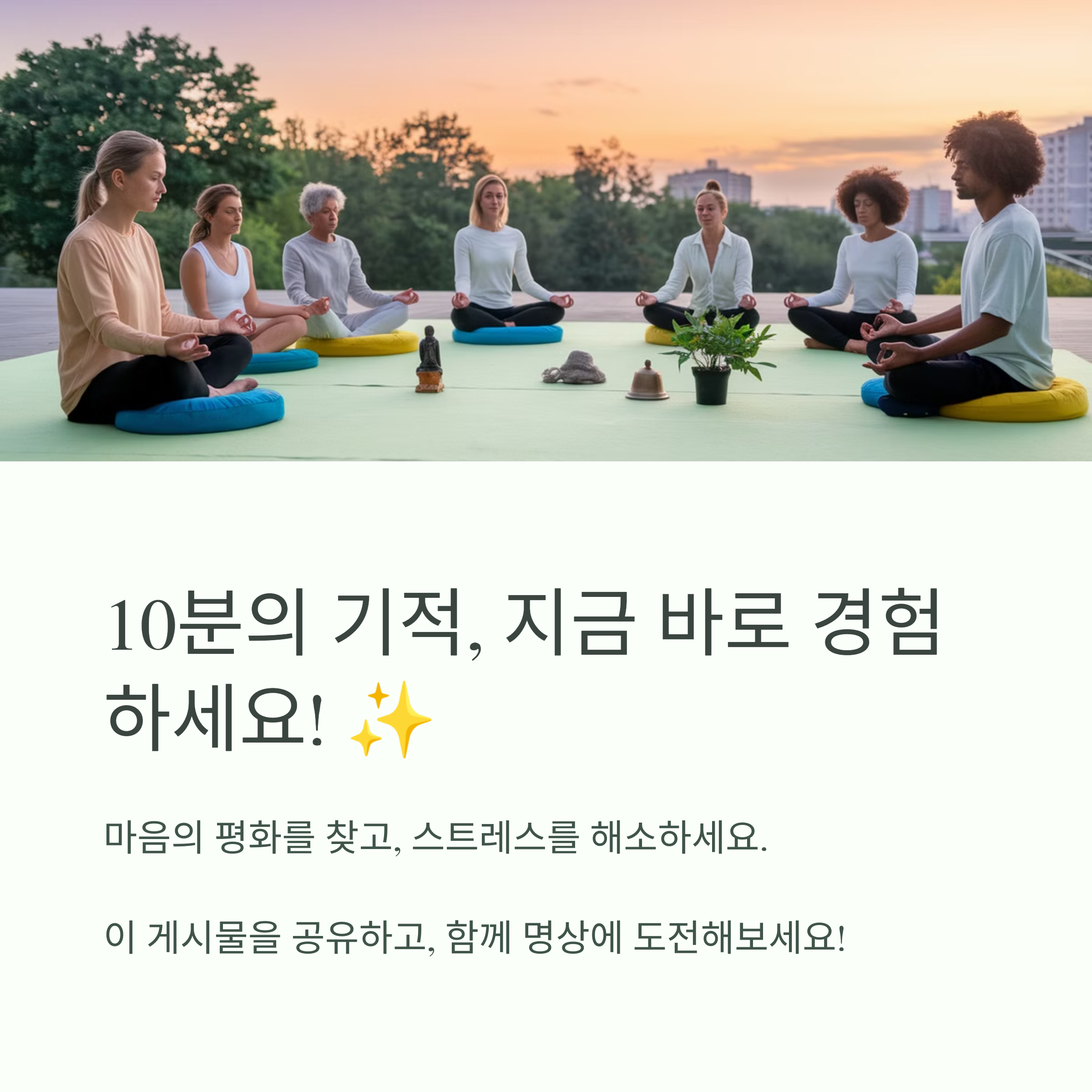 하루 10분의 명상과 호흡 운동은 누구나 쉽게 실천할 수 있는 습관입니다. 처음에는 익숙하지 않을 수 있지만, 지속적으로 실천하면 몸과 마음이 점차 변화하는 것을 느낄 수 있습니다. 작은 변화가 쌓이면, 더 건강하고 행복한 삶으로 이어질 것입니다.