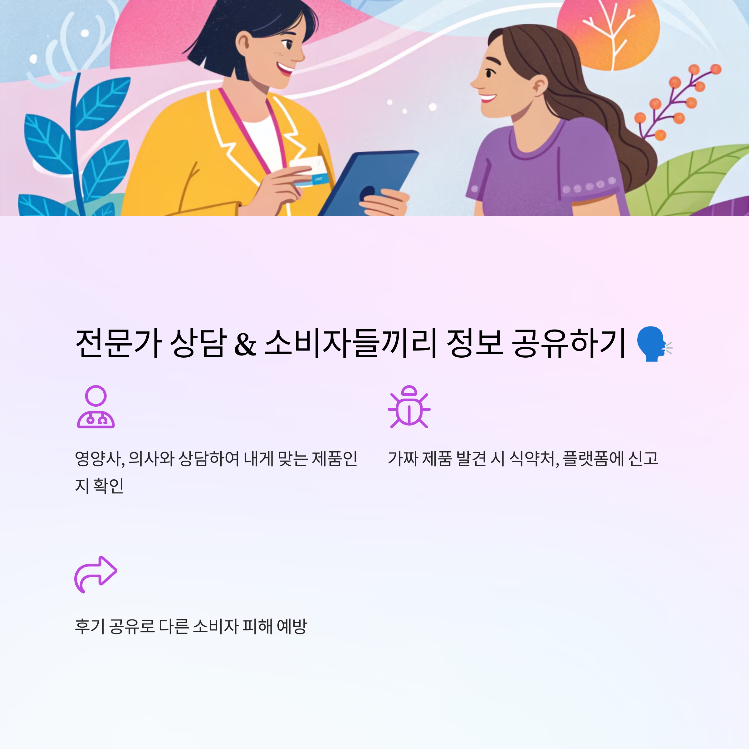 소비자들이 가짜 건강식품에 대한 정보를 나누면, 피해를 예방할 수 있어요.