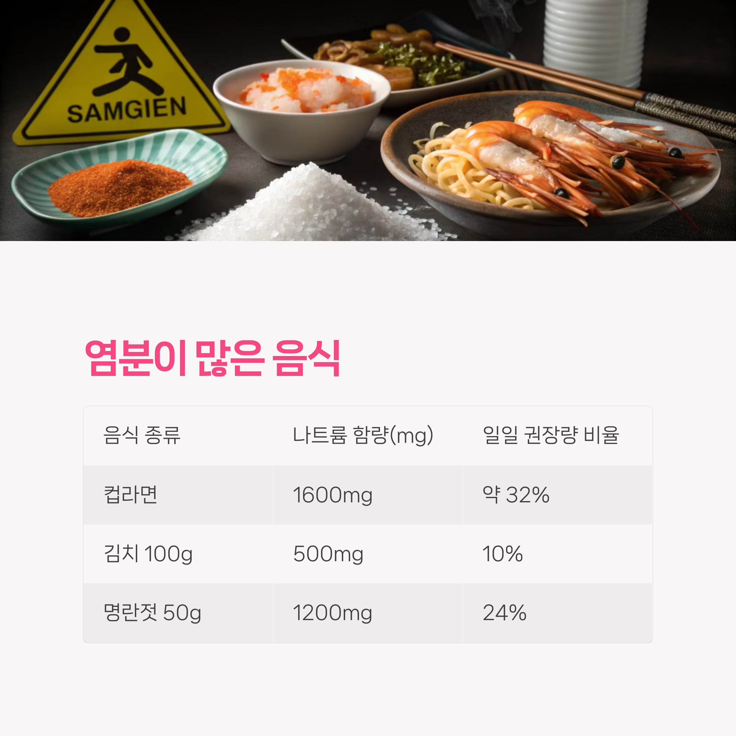 한국인의 밥상에서 빠질 수 없는 젓갈이나 김치, 라면처럼 염분이 많은 음식은 사실 혈관엔 꽤 부담이에요.