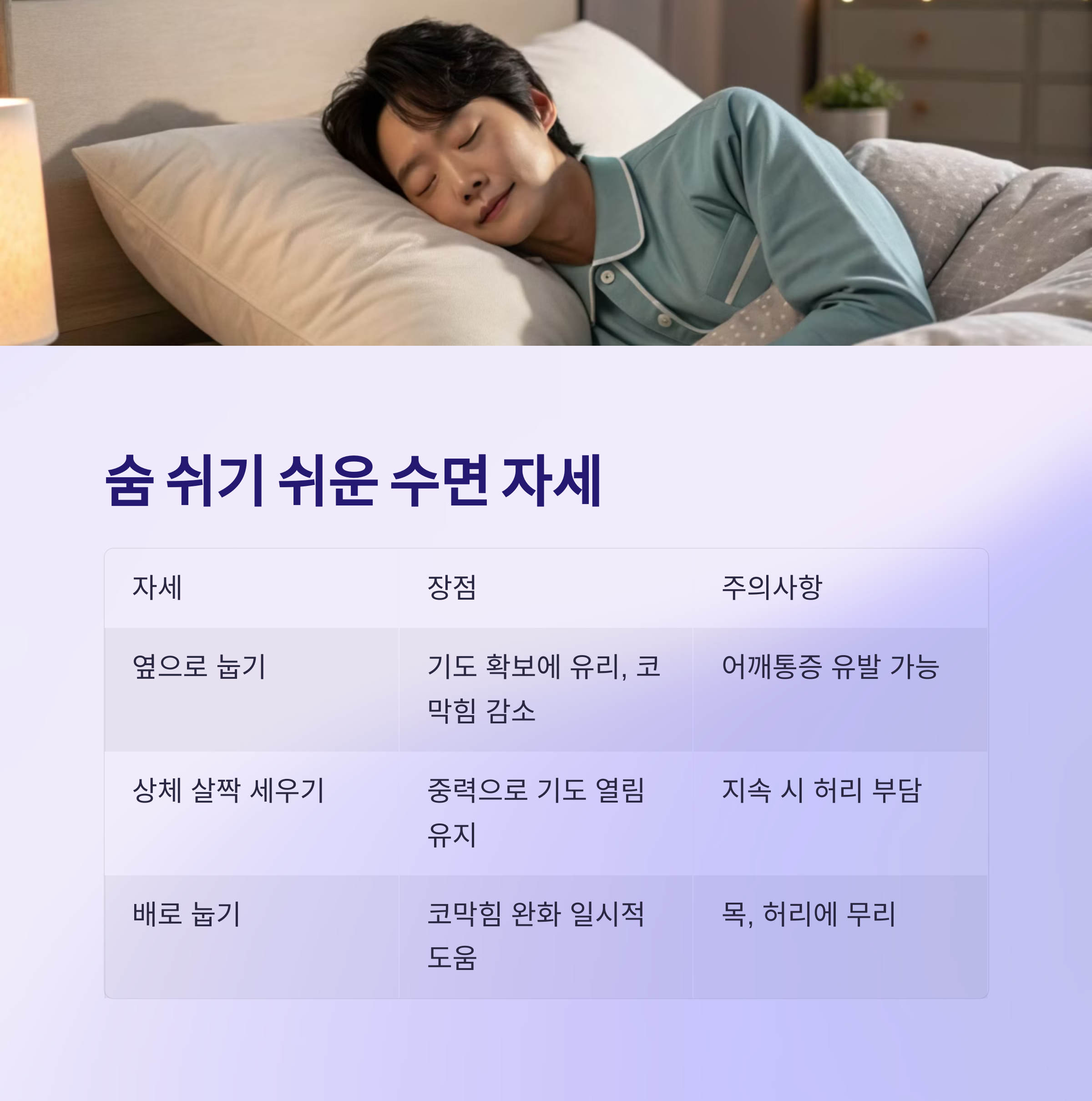 | 옆으로 눕기 | 기도 확보에 유리, 코막힘 감소 | 어깨통증 유발 가능 |